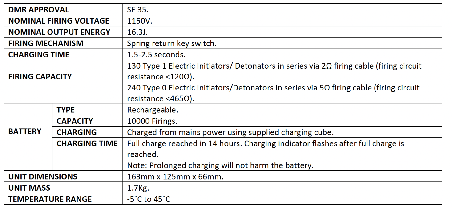 The Exploder fires up to 130 Type 1 (Shock tube Initiator or Stat safe®) electric initiators/detonators connected in series, where the total circuit resistance does not exceed 120Ω.