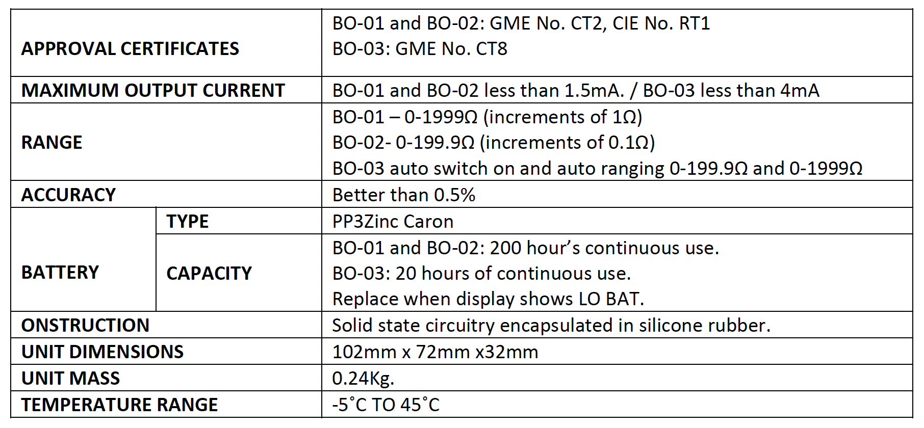 Models BO-01, BO-02, BO-03