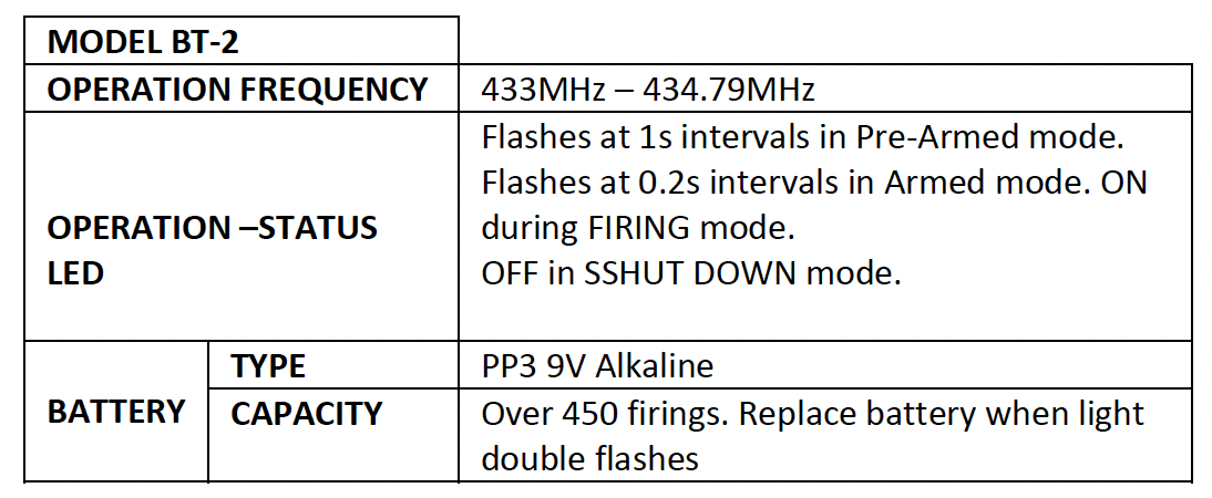 When at point of safety, press FIRE button while POWER switch is operated to fire. The STATUS light will double flash when the battery is low. Transmitter should only be opened for replacing PP3 9V Alkaline battery. Receiver can be recharged using Figure-8 cable from any standard Mains outlet.